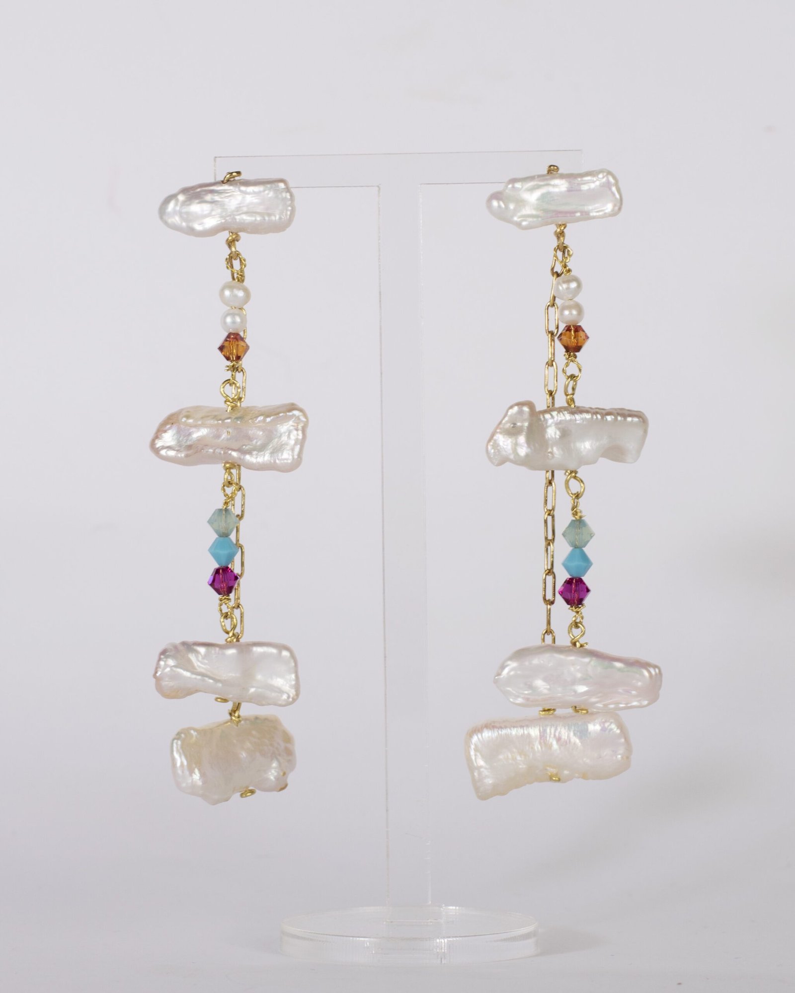 Una secuencia de perlas arrugadas que devuelven la luz con su peculiar destello, combinadas con cristal de swarovski en distintos colores. Los pendientes se componen de dos extensiones asimétricas que dan vida y movimiento a esta peculiar joya que ofrece la posibilidad de llevar perlas de forma alternativa a lo de siempre.